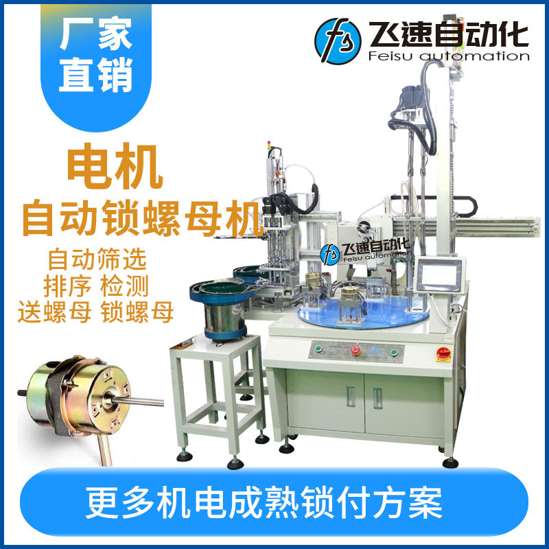 • 產品簡介: 風扇電機自動鎖螺母機自動送螺母、擰螺母、取產品均由設備自動完成。 電機風扇是一種具有風扇轂和葉片的電機,其作用是產生驅動轉矩的動力源,風扇電機主要由外殼、設于外殼內的轉子、固設于外殼內壁上且繞轉子設置的定子及端蓋組成。在組裝生產種需要用的五金標準件之一的螺絲進行安裝緊固,廠家生產一直都是傳統人工進行手工產品進行裝配一枚一枚螺絲擰緊或者采用一種電動螺絲刀來操作,在生產上不僅勞動強度大,生產效率低,而且在擰緊工件時無法控制力度,出現旋緊力不均或者容易滑牙等問題造成不良產品。 為此廠家會選購一臺自動化螺絲機來代替繁瑣的工作和提高工作效率 質量等,飛速自動化生產的轉臺式多軸自動鎖螺絲機,設備配置了一個轉臺多個工位操作,設備上配置了兩臺振動盤自動定向排序的送料設備,其工作目的是通過振動將螺絲自動有序定向排列整齊、準確地輸送到轉臺操作工位上然后由四軸把螺絲放置在配置好的工件上進行轉動扭緊螺絲釘,將擰好螺絲的產品由機械手自動送入出料倉,人工無需再去取產品,個過程都通過轉盤同時進行,各工位互不干擾,設備優勢在于減少人工作業量,工人放置產品即可,送螺母、擰螺母、取產品均由設備自動完成。